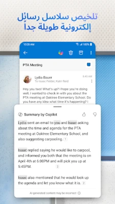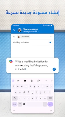 مصمم ليلائم احتياجاتك المتنوعة، يتوافق Outlook for Android بسلاسة مع حسابات Microsoft Exchange وMicrosoft 365 وOutlook.com وGmail وYahoo Mail، موفراً لك منصة موحدة لكل اتصالاتك. كما يوفر لك التطبيق إيماءات سحب بديهية وفلاتر ذكية لإدارة صندوق بريدك بكفاءة لا مثيل لها. ولمزيد من الراحة، يتيح لك التطبيق المصاحب لنظام التشغيل Wear OS مراجعة رسائلك وأحداثك بلمحة سريعة من معصمك. مع Outlook for Android، أنت المتحكم في تدفق اتصالاتك ومهامك اليومية، مما يمنحك التوازن المثالي بين الإنتاجية والهدوء.