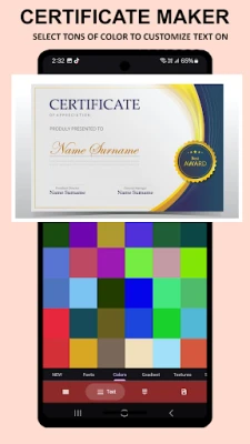اجعل شهاداتك مميزة مع تطبيق "قم بإنشاء شهادتك الخاصة". استكشف قوالب رائعة أو صمم شهادة فارغة، وزينها بملصقات من فئات متنوعة ونصوص مخصصة. أنشئ وخصص وشارك شهاداتك الفريدة بسهولة وابتكار لكل حدث.