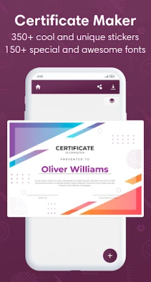 مع محرر الشهادات، ستجد مكتبة غنية لا تُضاهى من القوالب المصممة مسبقًا، الجاهزة لتكون نقطة انطلاق لإبداعك. يزخر التطبيق بموارد مجانية وفيرة، تشمل مجموعة واسعة من الخطوط الجذابة، الرموز المعبرة، والملصقات المتنوعة، بالإضافة إلى صور عالية الجودة، كلها متاحة لك دون أي تكلفة إضافية. يمكنك تخصيص كل قالب بسهولة فائقة بإضافة نصوصك الخاصة، أو توقيعك، أو حتى دمج صورك ورموزك لتعكس الهوية الفريدة لجهتك أو مناسبتك. لا حاجة لأن تكون مصممًا محترفًا لإنشاء تحفة فنية.