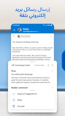 اكتشف Outlook for Android، الحل الشامل لإدارة بريدك الإلكتروني، تقويماتك، وملفاتك بسهولة. استمتع بتجربة علبة وارد مُعاد تصميمها، تجمع كل ما تحتاجه في مكان واحد فعّال ومثالي لإنجاز المزيد.