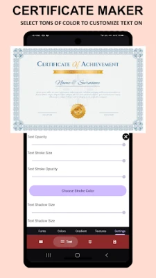 اجعل شهاداتك مميزة مع تطبيق "قم بإنشاء شهادتك الخاصة". استكشف قوالب رائعة أو صمم شهادة فارغة، وزينها بملصقات من فئات متنوعة ونصوص مخصصة. أنشئ وخصص وشارك شهاداتك الفريدة بسهولة وابتكار لكل حدث.