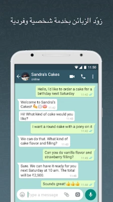 تصوّر منصة تجمع بين سهولة التواصل التي اعتدت عليها مع حلول أعمال مبتكرة. "واتساب للأعمال" هو رفيقك الرقمي لتمكين نشاطك التجاري. هذا التطبيق المصمم خصيصًا يضع بين يديك مجموعة متكاملة من الأدوات لمساعدتك على إدارة أعمالك بفعالية أكبر، بناء علاقات قوية مع عملائك، ودفع عجلة النمو نحو آفاق جديدة. إنه جسرك نحو تحويل المحادثات اليومية إلى فرص عمل مثمرة.